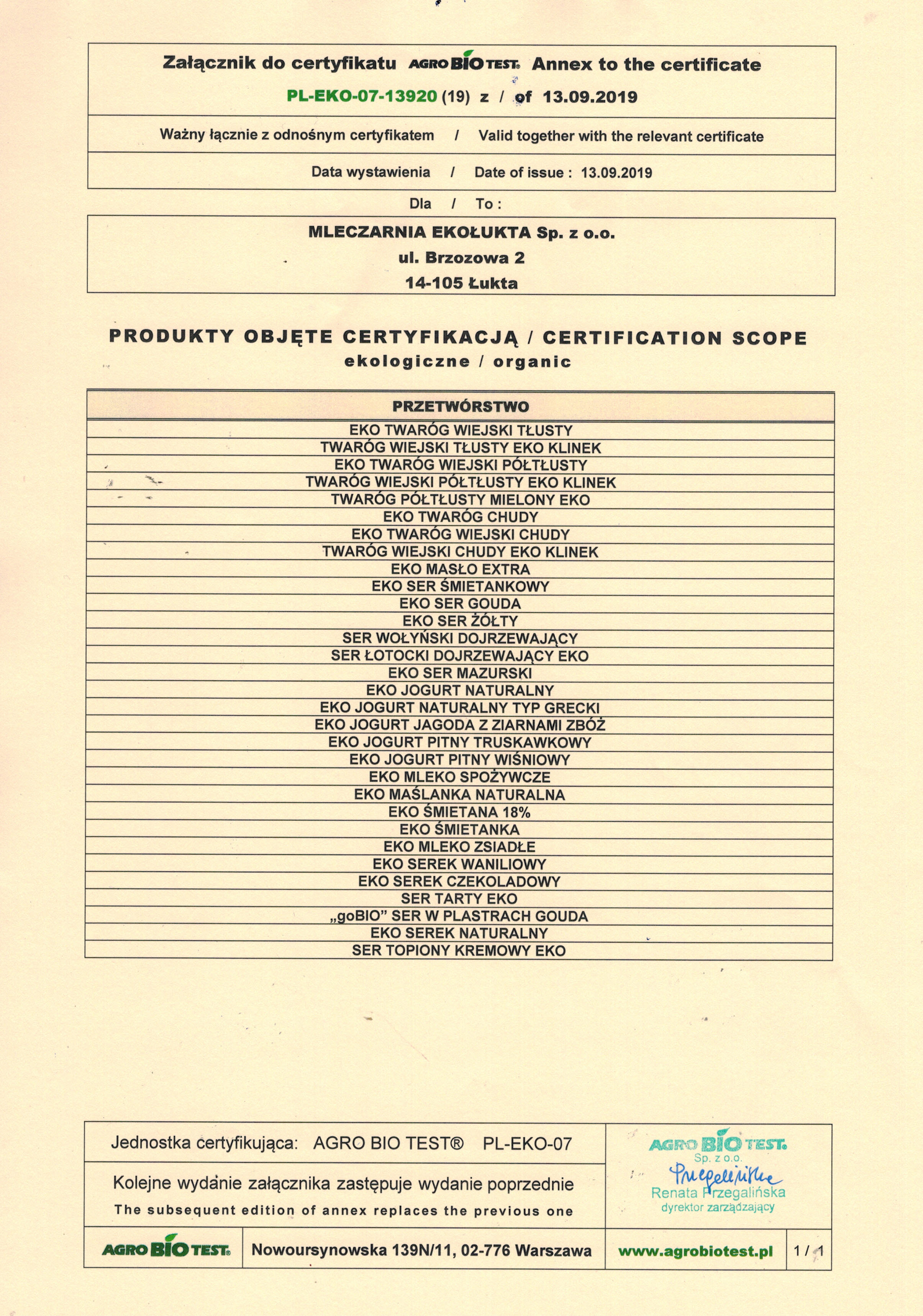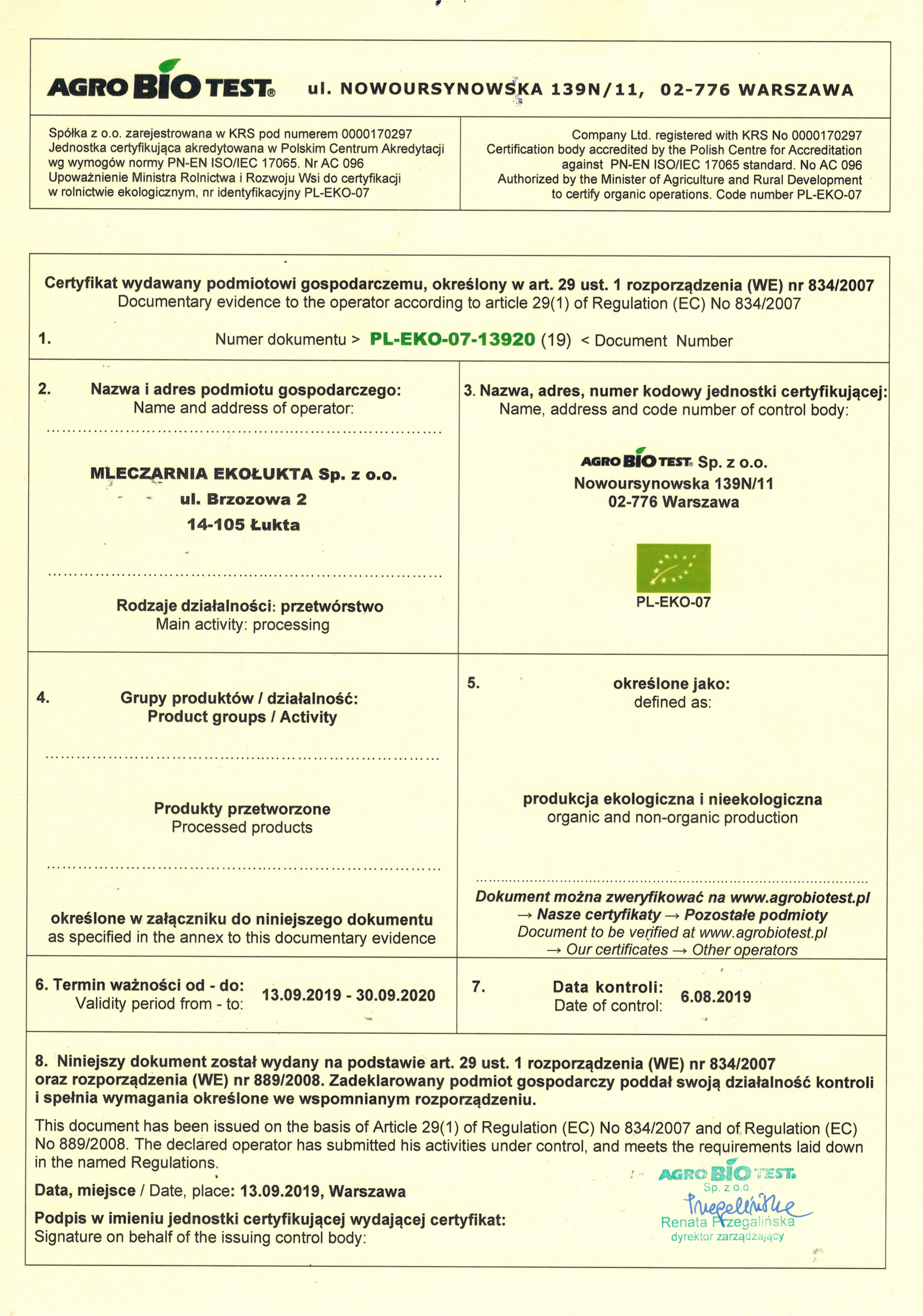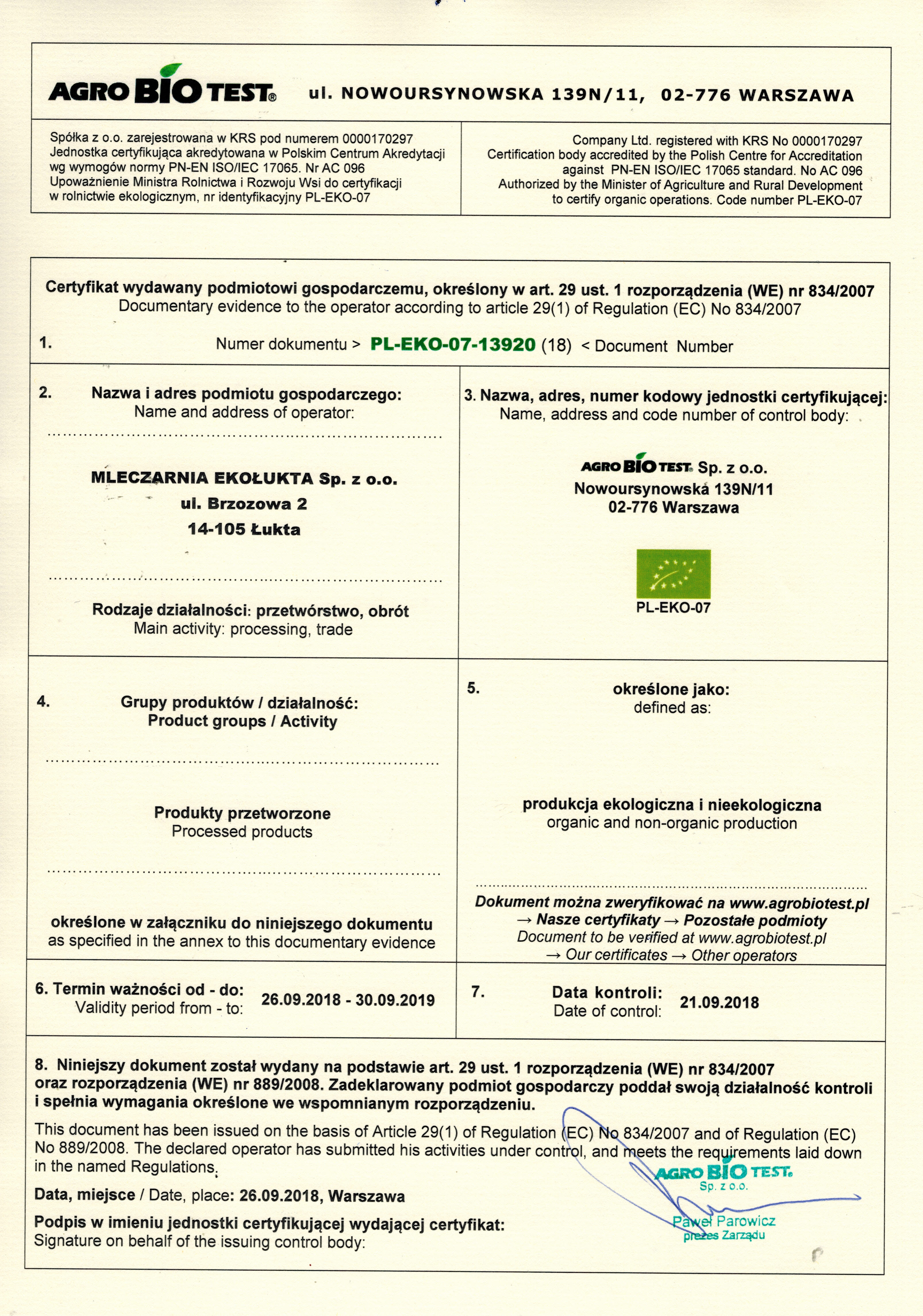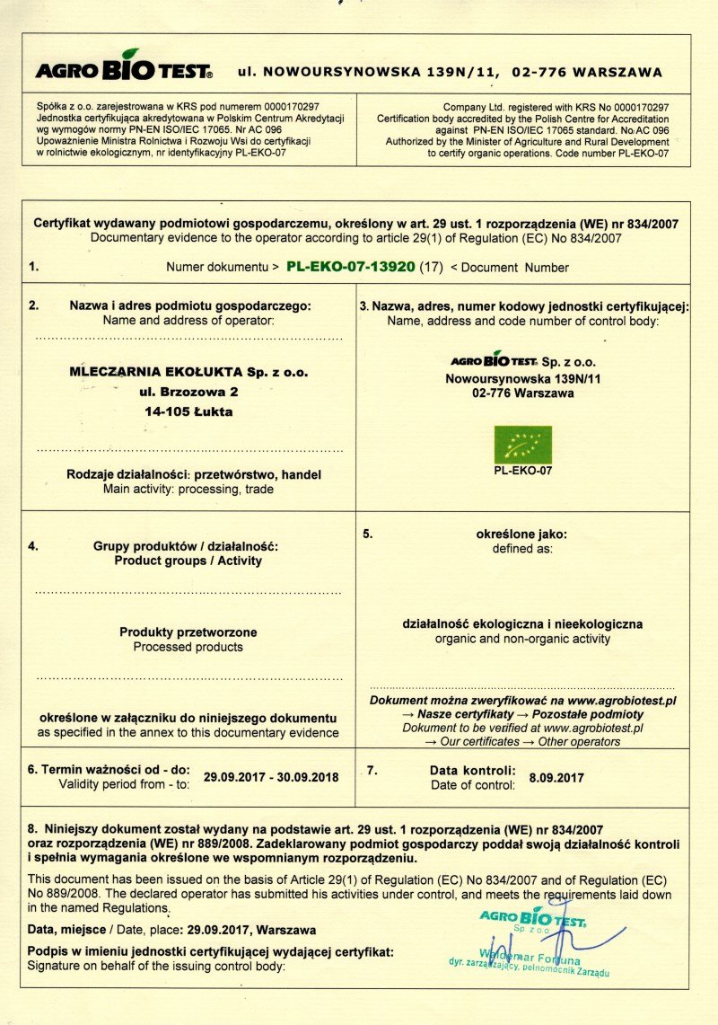 Od tego dnia mamy prawo oznaczać nasze produkty znakiem rolnictwa ekologicznego. Ponowna kontrola przeprowadzona w styczniu 2009 roku przedłużyła ważność certyfikatu ekologicznego do 30.06.2010. Aktualnie jest on zgodny z Rozporządzeniem Rady (WE) nr 834/2007 z dnia 28.06.2007 roku w sprawie produkcji ekologicznej i znakowania produktów ekologicznych i uchylające rozporządzenie (EWG) nr 2092/91.
