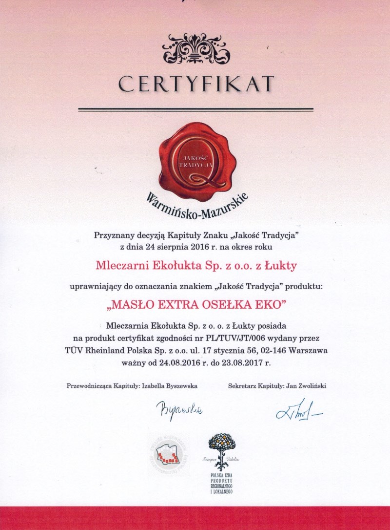 Mleczarnia EkoŁukta Sp. z o.o. jest niedużym przedsiębiorstwem mleczarskim położonym pomiędzy Olsztynem, a Ostródą, na czystych terenach Warmii i Mazur. Historia naszej firmy jest bardzo krótka: spółka została zarejestrowana w październiku 2007 roku, w celu zakupu od syndyka majątku upadłego przedsiębiorstwa „Łuk-Mił” Sp. z o.o. 30.10.2007 podpisana została umowa i rozpoczęto prace zmierzające do ponownego uruchomienia produkcji w zakładzie.